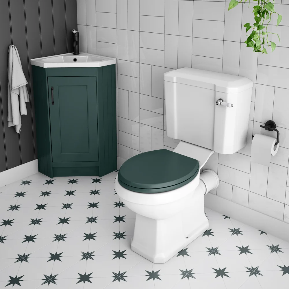 Tastefully panelled in satin green wood, the Chatsworth Traditional Green Corner Vanity Unit will bring a touch of class to your bathroom. Ideal for smaller bathrooms, cloakrooms and ensuites. The unit features a soft close door which limits the daily wear and tear and provides a quieter closing action. A corner basin crafted from durable white poly-marble sits on the top of the corner freestanding vanity unit while an matt black finish handle provides easy access and an additional flourish.