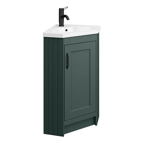 Chatsworth Traditional Green Corner Vanity Unit with Matt Black Handle – 1 Tap Hole
