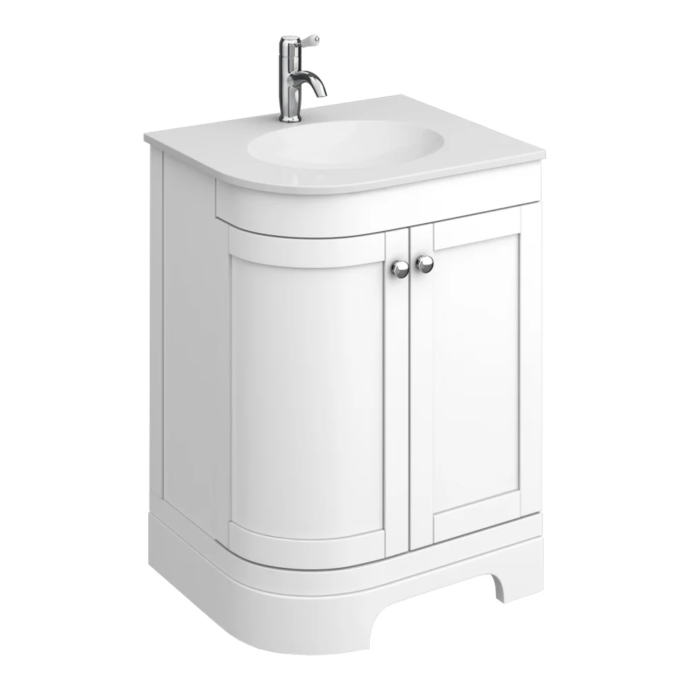 The Period Bathroom Company traditional 610mm wide White coloured offset curved vanity unit with white stone resin basin top, Victorian inspired design with a modern twist. The Period Bathroom Company range of charming bathroom furniture features satin finish with clean lines and recessed centre panels for a classic look.