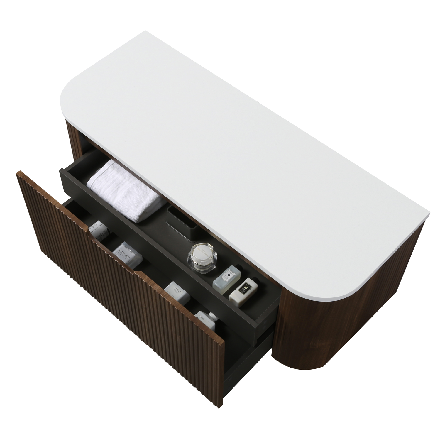 The unit is paired with a stunning matt white polymarble countertop, supplied undrilled to give you complete flexibility when selecting and positioning your washbasin and taps. Its gently curved form enhances the visual appeal while offering generous surface space for your chosen countertop basin. The combination of walnut and matt white creates a striking contrast, making this vanity unit a true focal point in your bathroom.