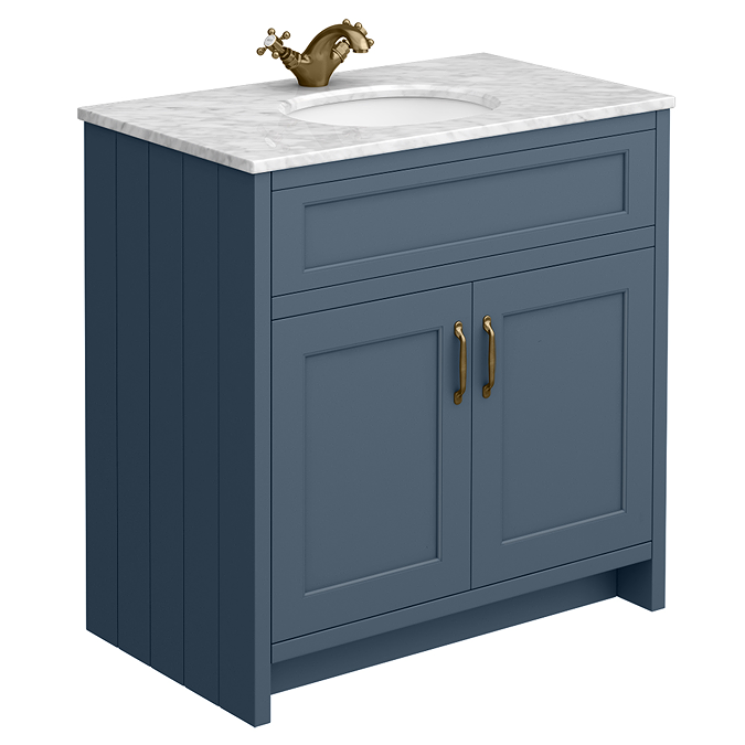 The Chatsworth traditional 810mm wide blue vanity unit with marble basin top, Victorian inspired design with a modern twist. The Chatsworth range of charming bathroom furniture features classic styling with a satin blue finish cabinet and tongue-and-groove side panelling.