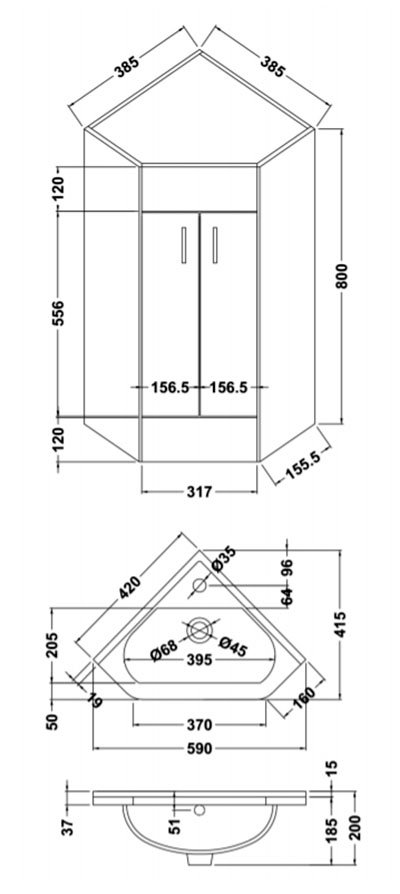• Corner design for space-saving in smaller bathrooms or cloakrooms