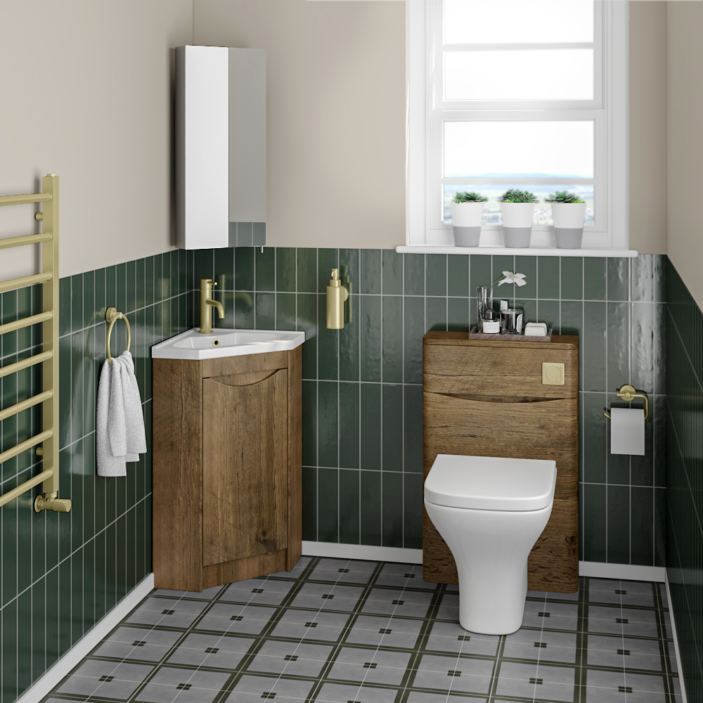The Monza Chestnut wood effect corner floor standing vanity unit is a stylish and practical addition to any modern bathroom. Its unique design allows it to fit seamlessly into the corner of your bathroom, making the most of your available space and creating a focal point. The unit features a single door with a minimalist cut out handle, providing ample storage space for all your bathroom essentials. The high-quality construction ensures that the unit is durable and built to last, while the sleek and stylish design adds a touch of sophistication to your bathroom. The unit is easy to install and comes with all the necessary fittings. With its practicality and modern design, the Monza corner floor standing vanity unit is the perfect choice for any bathroom renovation or upgrade.